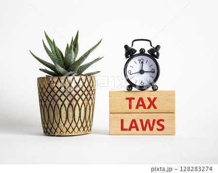 Tax Laws symbol. Concept word Tax Laws on wooden blocks. Beautiful white background with alarm clock and succulent plant. Business and Tax Laws concept. Copy space