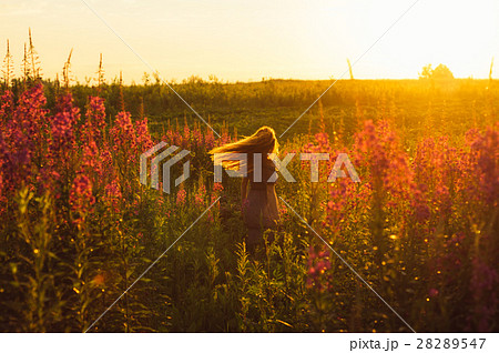 Dancing beautiful girl on field, sun backlight