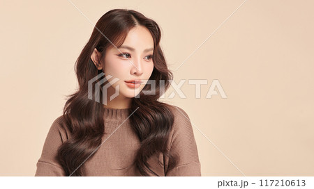 Beautiful young asian woman with clean fresh skin on beige background, Face care, Facial treatment, Cosmetology, beauty and spa, Asian women portrait.
