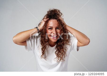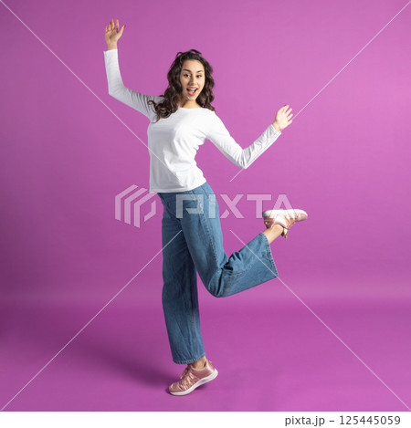 A woman in a white shirt and ripped jeans posing positively with a playful expression in a light studio setting