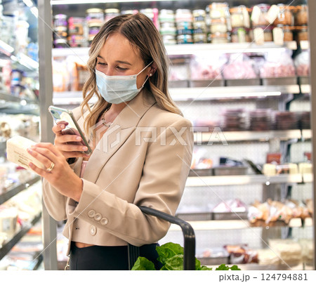 Grocery store, woman covid mask and phone food ingredient check of a retail customer. Groceries shop of a person looking at a mobile app for a healthy diet label shopping in a supermarket checking