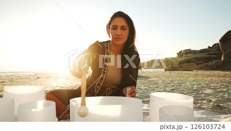 Meditation, sound therapy and woman with bowls at beach for mindfulness, spiritual cleanse and energy. Nature, morning ritual and person with frequency for healing, balance and wellness by ocean