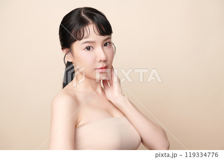 Beautiful young asian woman with clean fresh skin on beige background, Face care, Facial treatment, Cosmetology, beauty and spa, Asian women portrait.