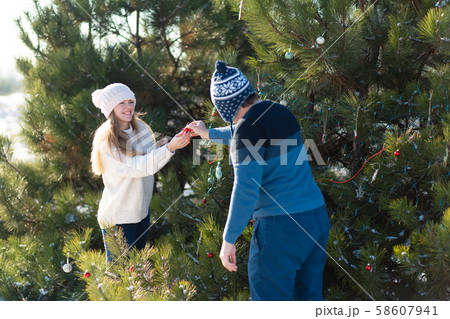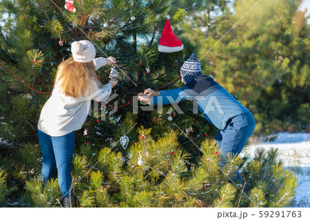 a guy with a girl decorates a green Christmas tree