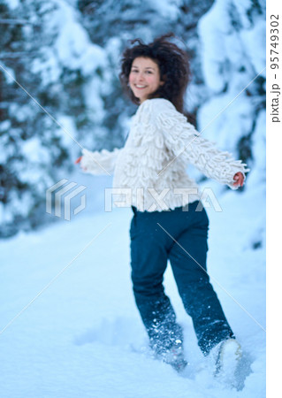 The woman having fun walking in snow covered winter forest