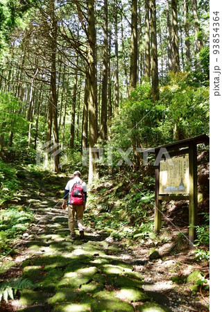 箱根町 箱根旧街道(旧東海道)案内板と石畳とハイカー