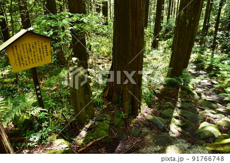 箱根町 箱根旧街道(旧東海道)の西海子坂案内板と石畳と新緑