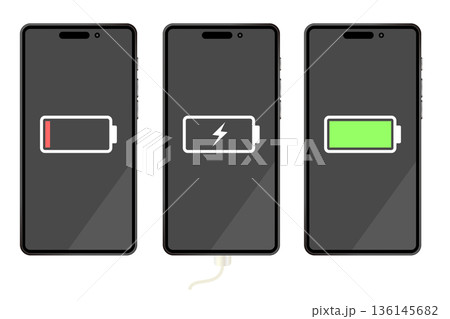 スマートフォンの充電の状態を表すイラストセット|充電切れ・充電中・充電完了