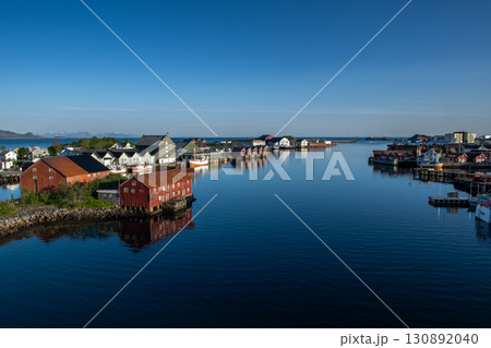 Harbor And Rorbuer Huts At Midnight Sun In Svolvaer City On Lofoten Islands In Norway