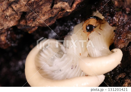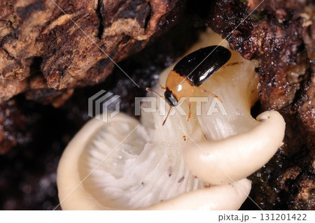 生き物 昆虫 シベリアチビオオキノコ、前胸と足はオレンジ色で頭と翅は黒色。ウスヒラタケの幼菌で