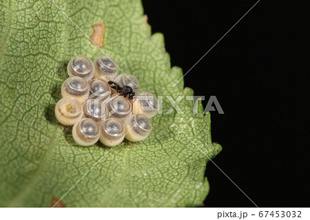 生き物 昆虫 チャバネクロタマゴバチ、チャバネアオカメムシの卵の周りを歩く