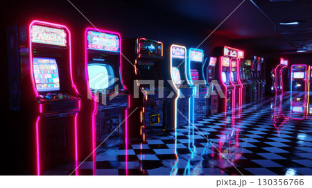 Arcade machine with neon light in dark room with checkered floor reflecting colorful glow creating vibrant atmosphere