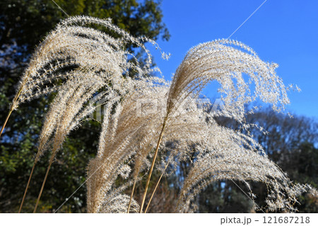 青空の下、晩秋の光を浴びてキラキラと輝きながら風に揺れるススキの穂のアップ