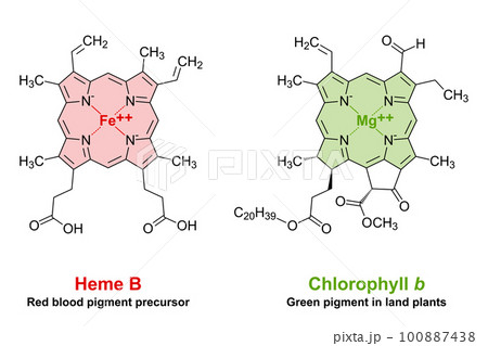 Heme and chlorophyll similarities in chemical structure. A plane porphyrin ring with 4 nitrogen atoms, binding an iron atom for the red blood pigment, and a magnesium atom for the green plant pigment.