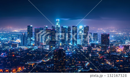 青と紫の光に包まれた大都市の夜景と高層ビル群