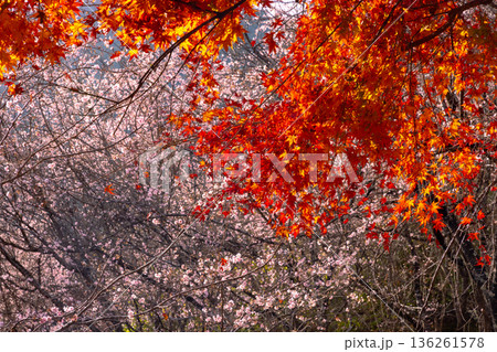 埼玉県児玉郡神川町矢納 冬桜と紅葉の名所町立城峯公園 満開の冬桜ともみじなどの紅葉の競演