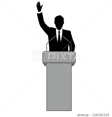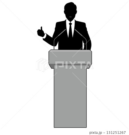 胸にバッジを付けた男がマイクを持って真剣な表情で話しているイラスト