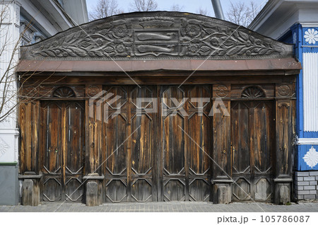 Old carved wooden gate of the 19th century in Gorodets, Russia