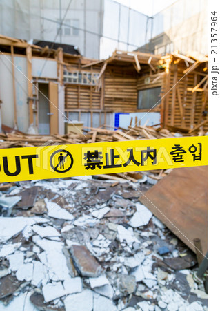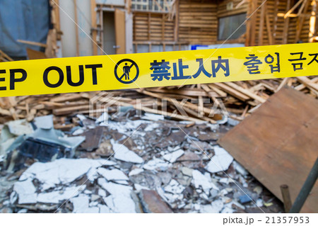 立入禁止 立ち入り禁止 住宅解体業者 家を壊す 全壊 建築物解体作業 木材 廃材 壊す 日本建築