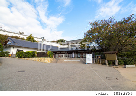 日本の兵庫県の姫路市 世界遺産で国宝でもある姫路城 春の桜と青空と立派な天守閣 入城口の建物と柵