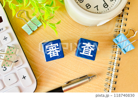 審査と書かれたブロック、電卓、スマホ、ノート