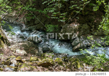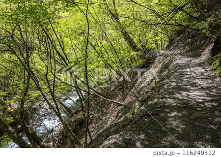 奥秩父荒川源流域の入川渓谷に沿う新緑の軌道跡