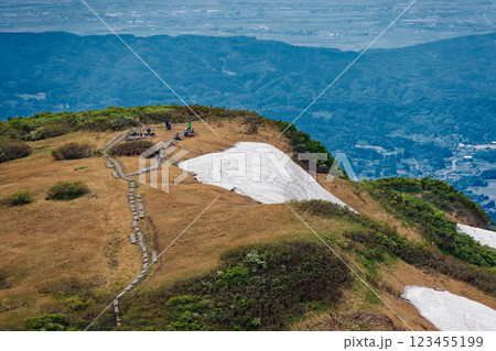 初夏の守門岳山頂から見る青雲岳と長岡方面の街並み