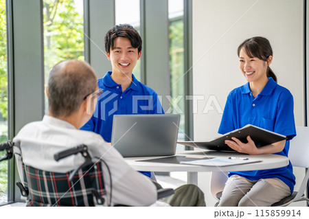 カウンセリングする介護スタッフとシニア男性