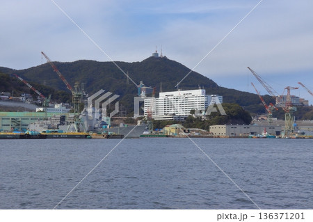 海上から眺める長崎造船所と稲佐山展望台(長崎県長崎市)