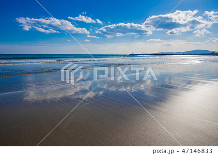 青空快晴の中で静かに海水面に映る入野海岸