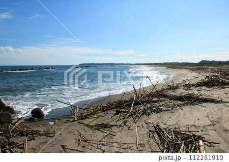 夷隅川河口右岸の砂浜に打ち寄せられた流木