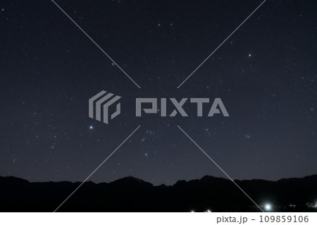 北杜市白州町、南アルプスの山並みとオリオン座と冬の大三角