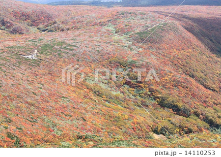 風景、自然、紅葉、植物、写真 岩手山を望む イタドリ八幡平国立公園の黄葉紅葉