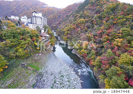 渓谷に迫り出した温泉施設と芦ノ牧温泉の紅葉、会津、福島県