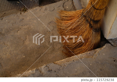 A broom made of natural materials, knitted from dry plant branches, stands against the wall next to the stairs