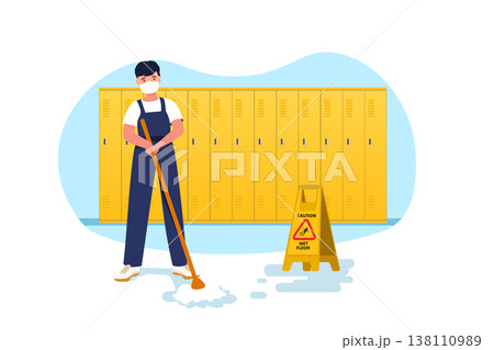 Minimalist flat vector illustration of a janitor in a face mask mopping the floor in a locker room, professional cleaning service for school or gym concept.