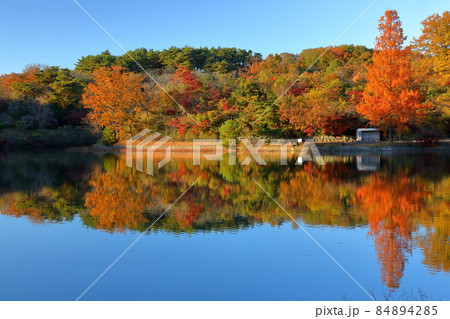 埼玉県比企郡吉見町黒岩 八丁湖公園八丁湖の紅葉の水鏡