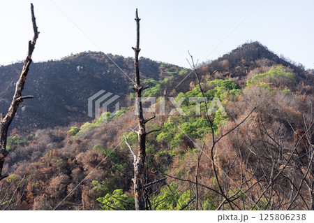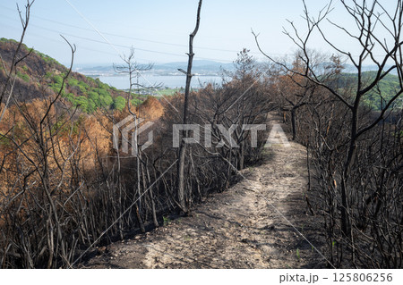 日本の岡山県児島半島の八丈岩山の山火事後でも美しい風景