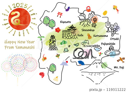 山梨県の観光地のイラストマップ年賀状2025年