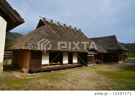 初冬の八塔寺ふるさと村 茅葺き屋根の家と納屋 岡山県備前市吉永町