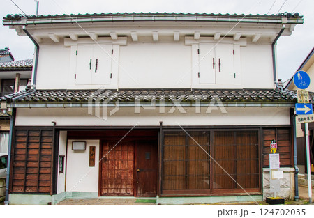 富山県 氷雨降る おわら風の盆の八尾 毛利館の白壁と格子戸