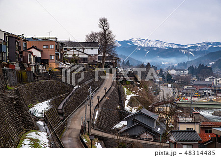 富山 八尾 石垣の町並み 坂のまちと煙たなびく雪山 2019.02 c