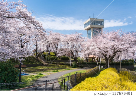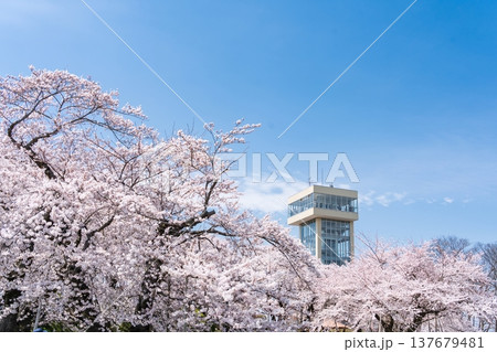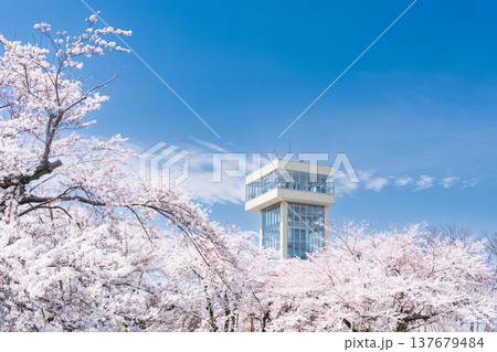 「青森県」満開の桜と舘鼻公園の風景 八戸市