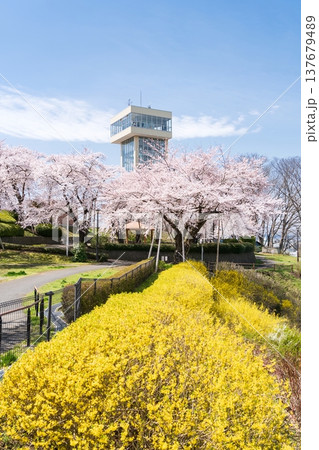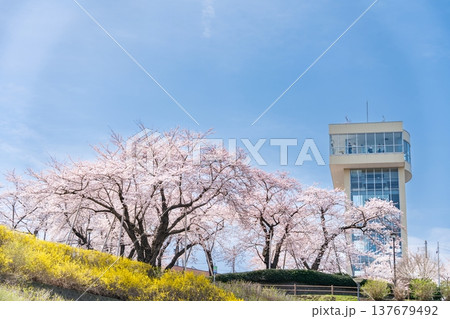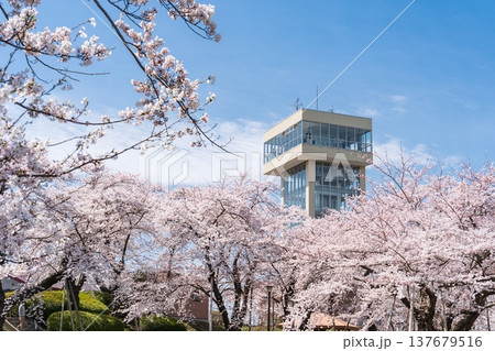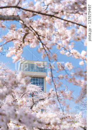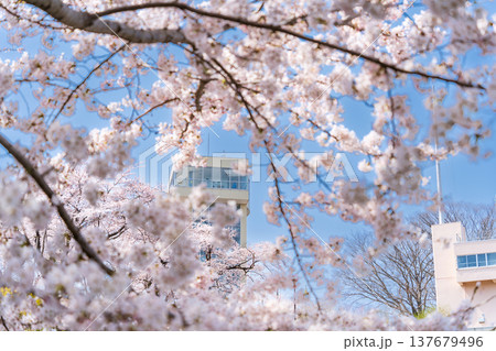 満開の桜とグレットタワーみなと(青森県八戸市)