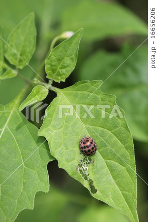 ジャガイモの葉の上にニジュウヤホシテントウ
