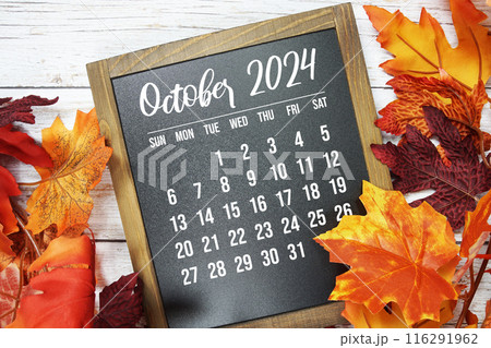 October 2024 monthly calendar maple leaf decoration on wooden background