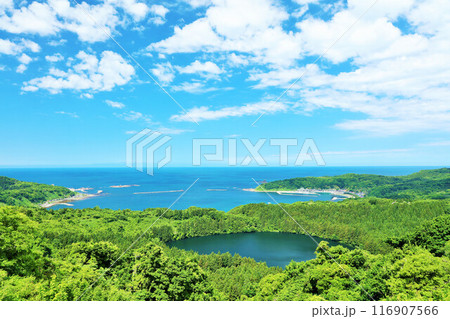 秋田県男鹿市戸賀浜塩谷和山 八望台展望台付近から新緑の青い一ノ目潟