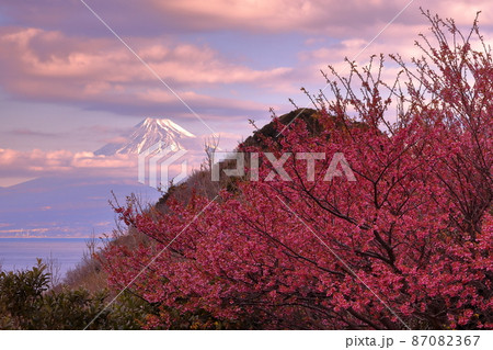 静岡県伊豆市八木沢 西伊豆歩道丸山コース里山園地の土肥桜と朝日を受ける朝焼けの富士山