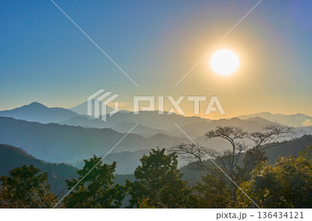 東京都八王子市の高尾山頂(大見晴園地)からの夕景(富士山,山並み,夕陽など)