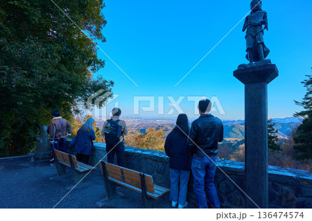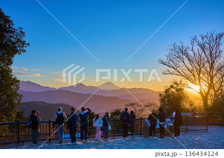 東京都八王子市の高尾山頂(大見晴園地)からの夕景(富士山,山並み,夕陽,観光客など)